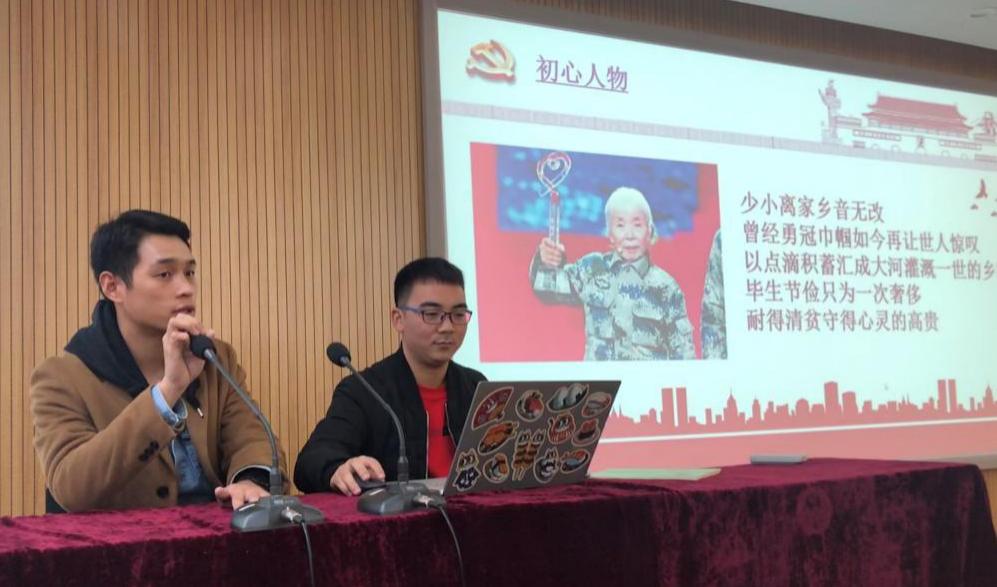 活动在嘹亮的国歌声中拉开序幕。重温入党誓词后,主持人陈垒向我们介绍了本次活动的初心人物——“木兰奶奶”马旭。从视频及图文资料中,我们可以知道,马旭是中国空降兵部队第一代女空降兵,总计跳伞140多次,并创造了三项中国之最——第一个跳伞女兵、跳伞次数最多女兵、实施空降年龄最大女兵。马旭离休后,并没有“安享晚年”,而是仍忙着医学科研。一生清贫的她,将毕生积蓄1000万元无偿捐献给家乡的教育事业,被誉为“新时代最可爱的人”,并于2019年2月获评“感动中国2018年度人物”。