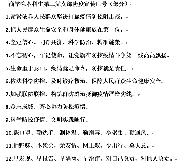 据悉,自疫情发生以来,伟德国际victor1946本科生第二党支部全体党员始终高度关注疫情发展,以一己之力为打赢疫情防控阻击战做出贡献。通过自愿捐款、报名参与志愿者、为干警医护人员子女辅导功课等形式参与此次活动。党支部所有党员在宣传委员和党小组组长的带领下集体承诺,纷纷表态将严格遵守疫情防控的各项规定,彰显当代大学生党员的责任与担当。不少党员还手写承诺书,共同编制防疫口号,绘编疫情报告,用当代学生党员的方式为防疫贡献自己的一份力量。