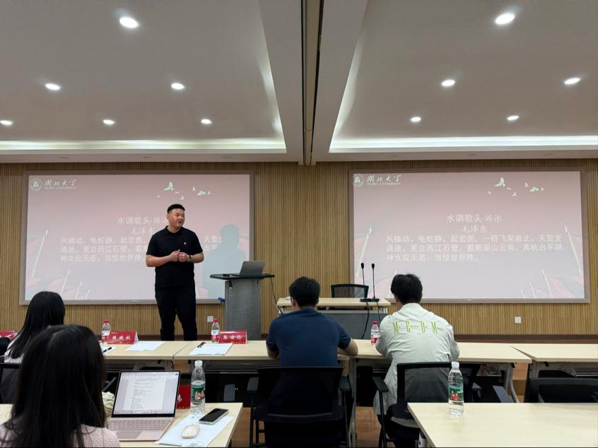“毛主席是第一位把一项运动写作诗词题目的作家,因为往往文学创作不会写《水调歌头·羽毛球》或者是《水调歌头·乒乓球》。《水调歌头·游泳》这首词写得极具浪漫气息。当体育运动与文学相结合,当古代神话同现代化建设相结合,就能展示出人们无限的创造力。”文学院学硕三支部书记张佳伦以《“文”以载道,“体”现精神:文学视角下的体育人文内涵》为题,从毛主席的词作切入,阐释了体育作为文化载体的重要性,他强调体育不仅锤炼身体,更是精神与文化的象征。