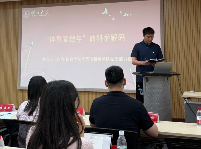 在主旨汇报环节,伟德国际victor1946国际商务研究生党支部书记陈晚秋围绕《体重管理年:从“个人自律”到“强国之治”的党员答卷》展开论述,强调个体健康与国家发展之间的密切关联,呼吁新时代青年党员用“小自律”托举“大担当”。体育学院优势项目运动队党支部书记向辉则以《“体重管理年”的科学解码》为题,结合专业视角分析体重管理的科学内核。生命科学学院研究生第三党支部书记李莹超从《走进糖的科学世界》出发,普及了糖类摄入对身体健康的影响,引导科学饮食。