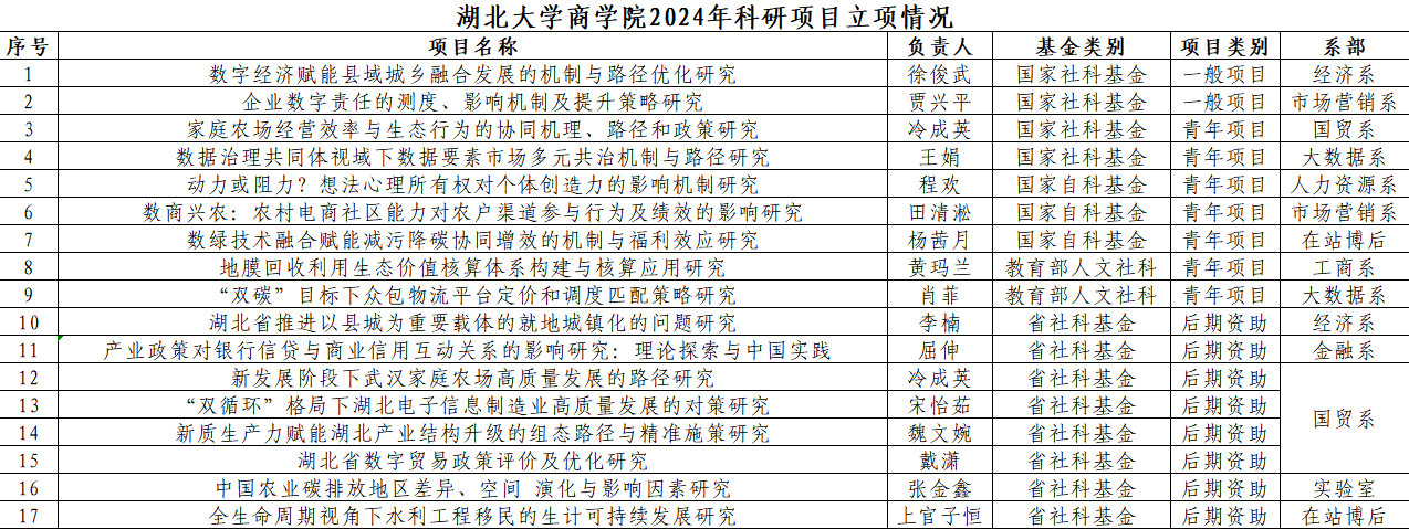 近日,全国哲学社会科学规划办公室、国家自然科学基金委、教育部社会科学司和湖北省哲学社会科学工作领导小组办公室相继发布申请项目评审结果,我院共获批项目17项,其中国家社科基金4项、国家自然科学基金3项、教育部人文社科基金2项、湖北省社科后期资助项目8项。我院国家自然科学基金和湖北省社科后期资助项目在文科学院立项数排名前列。