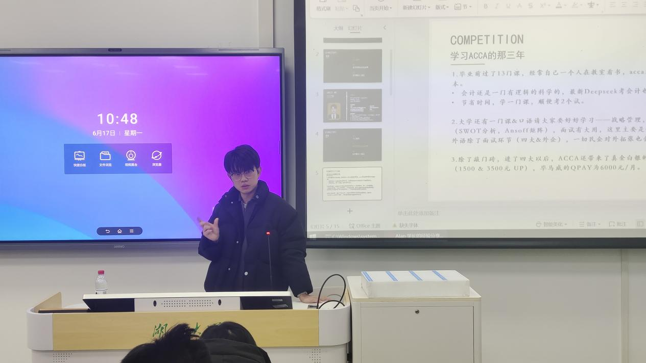 第三位分享的校友是2013级ACCA方向班毕业生张昊,现进入中建三局集团有限公司。他分享了自己从本科到研究生再到职场的成长历程,他认为,ACCA的学习不仅提供了系统的财务知识,还培养了国际化的视野和思维方式。此外,他建议同学们在大学期间多实习,积累实际工作经验,并保持学习能力,以应对职场中的挑战。