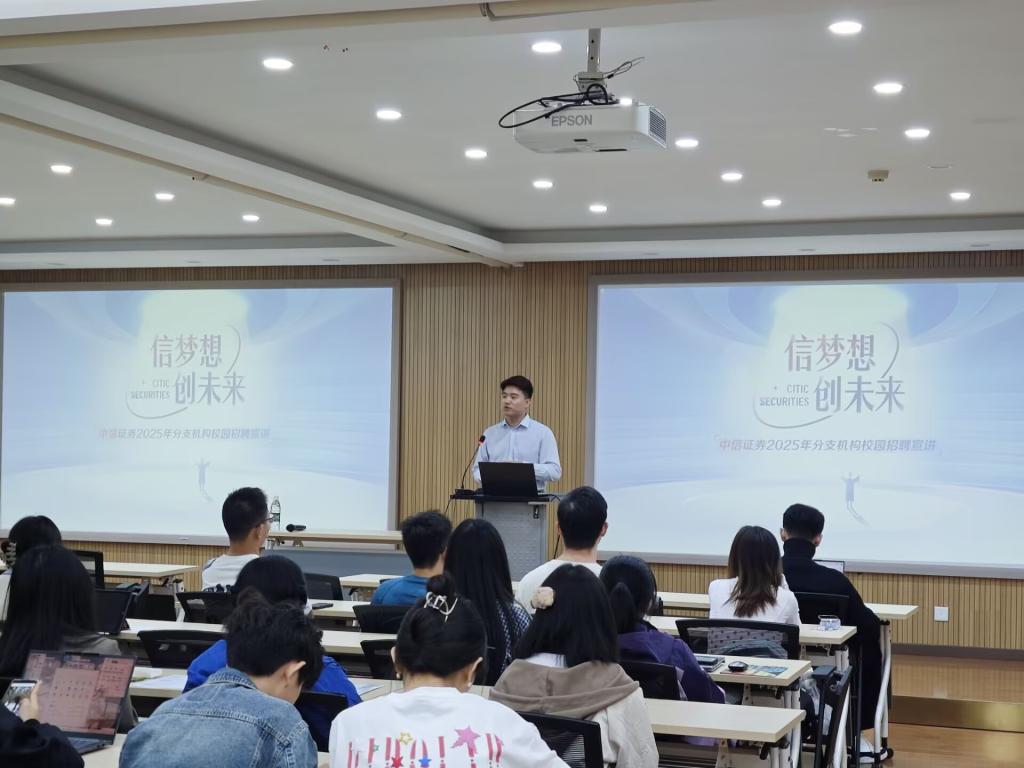 宣讲会特邀中信证券2022届优秀管培生库磊担任主讲人,库磊凭借丰富的行业经验和职场心得,为同学们带来了一场别开生面的讲座。讲座内容丰富,涵盖证券行业前沿动态、职业生涯规划和校园招聘宣讲等板块,主讲嘉宾详细介绍了当前证券市场的热点问题和发展趋势,并为在场毕业生提供了宝贵的职业发展建议。