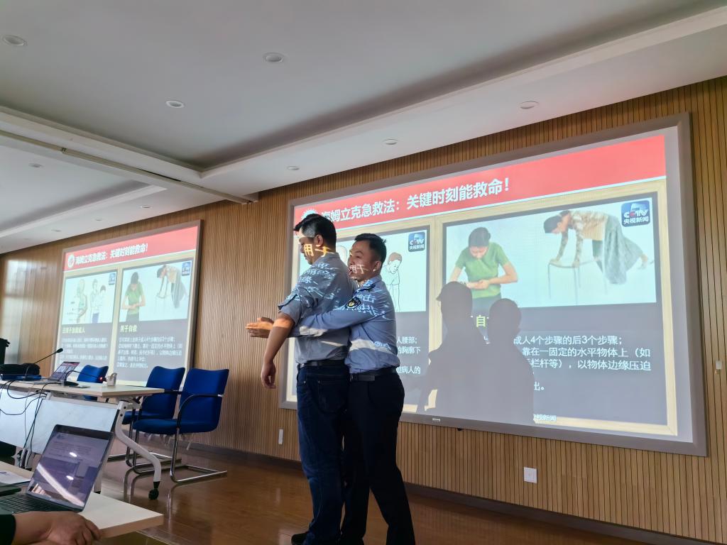 易教官从新安法全员责任制、近期火灾案例分析、用电安全及隐患、急救(海姆立克或心肺复苏)、突发情况的应急处理、器材的认识及使用方法六个方面进行生动的讲解。互动环节,易教官邀请现场老师上台,仔细演示了海姆立克急救方法,提高了大家应对意外事件的效率和准确性。