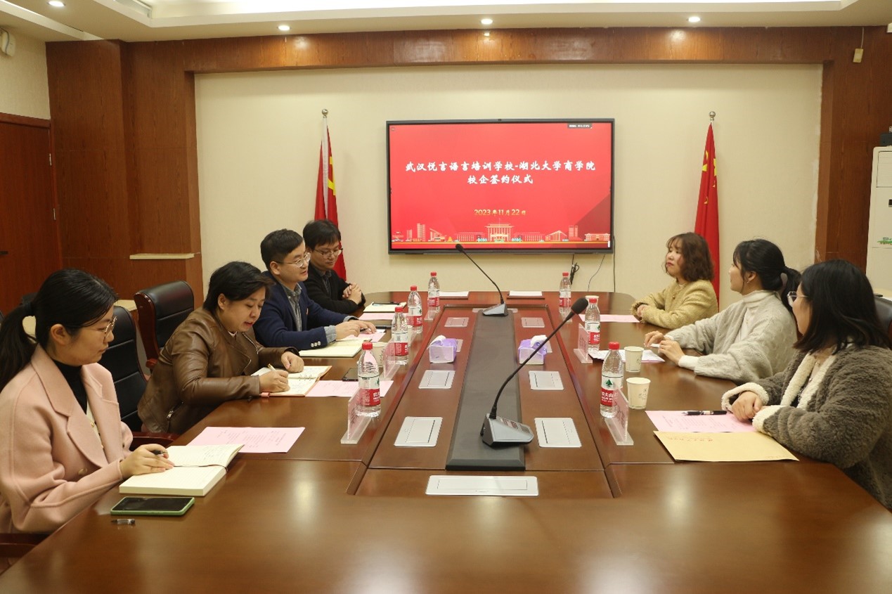 11月22日,伟德国际victor1946与武汉悦言语言培训学校校企合作签约仪式在逸夫楼C2008会议室举行,伟德国际victor1946党委副书记邵阡,学工办辅导员甄国辉、吴美娅、胡俊杰,武汉悦言语言培训学校校长徐苏敏、销售部经理宋改革、教师张晓玥参加签约仪式。