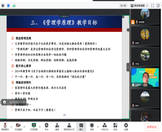 来自人力资源、经济学等系部的9位参赛教师结合参赛课程进行了教学创新设计汇报,体现出“以学生发展为中心”的理念、课程思政融合教学的设计与创新、成果导向的教学设计与创新等。