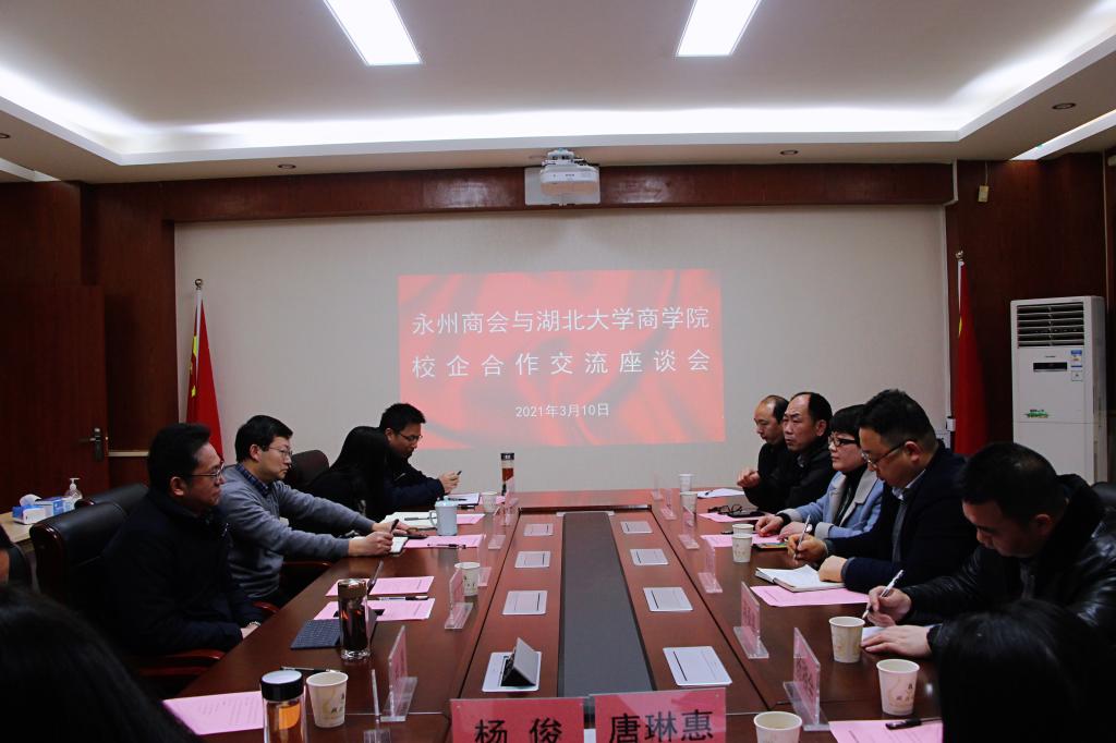 会上,郭志文对永州商会一行人来我院洽谈表示欢迎,并向负责人介绍了学院发展历程、商科教育项目、学科建设成绩等方面的具体情况。朱家元介绍了永州商会以及企业基本情况,表示希望促进企业、商户、学习三方的合作,发挥各自优势,形成产教融合。