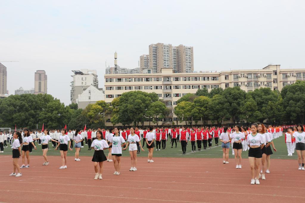 全院队列入场后,部分学院一同进行了广播体操展示,同学们跟着口号踏步、伸展,每一个动作都标准统一。紧接而来的是团体操表演,红衣白裙的女生们跃动舞步,借着道具扇将田径场变成繁花盛开的海洋。面对观众的震撼,一位国英专业的团体操队员欣慰道:“尽管在两个月的准备时间里花费了很多精力,但看见呈现效果很不错,就觉得付出都是值得的。”