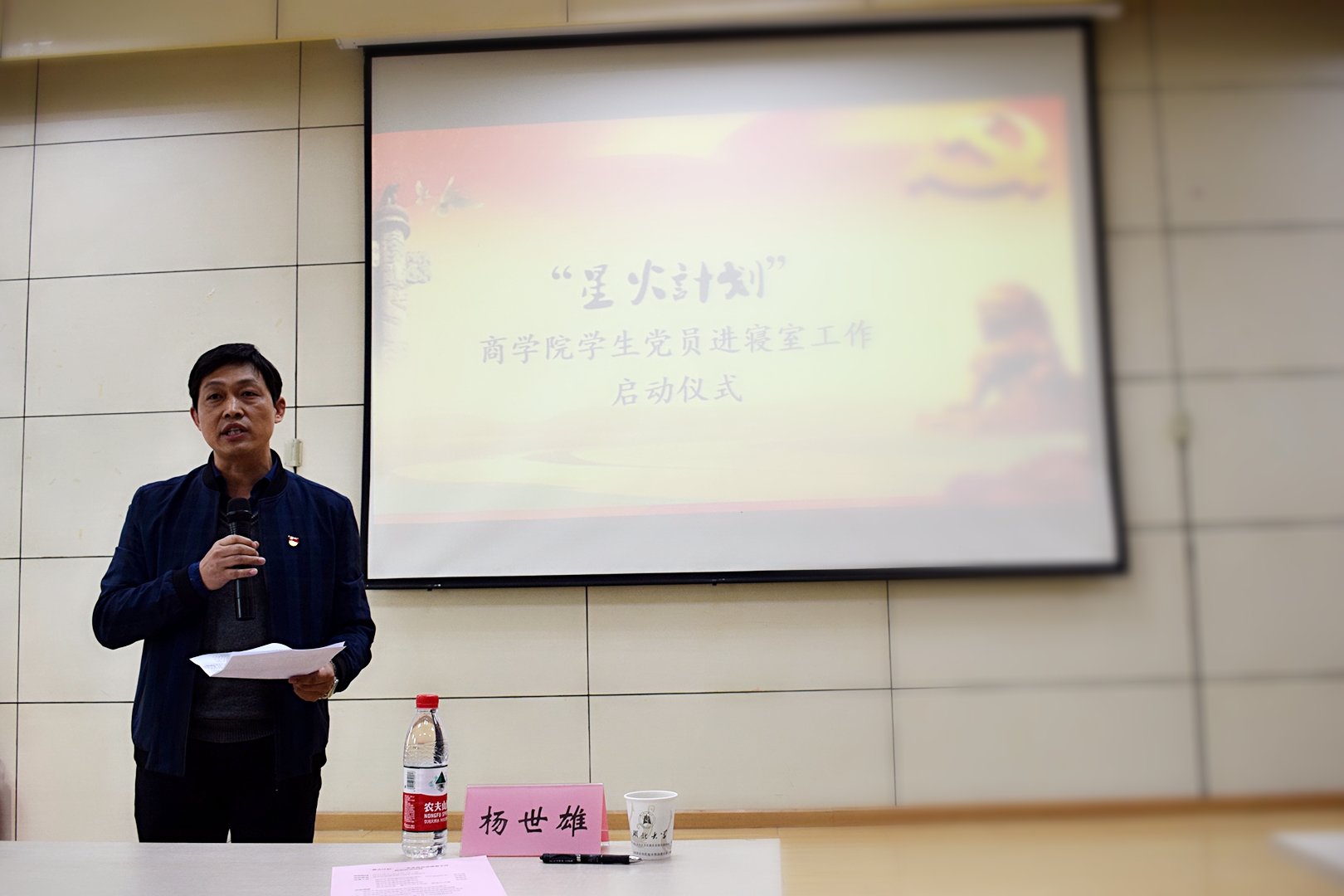 在活动开始,甄国辉老师对刘靖君,杨世雄,焦颜成,张丽娜分别进行了简单的介绍,并邀请张丽娜上台向学生们介绍本次“星火计划”。张丽娜通过PPT向在座老师及同学们讲解了本次活动的背景,意义以及活动进行的形式,并表示对于本次活动十分看好,认为伟德国际victor1946带头开展的此次活动在学生寝室管理和学生思想引导上具有重要意义。在张丽娜讲话结束后,焦颜成上台对于学生党员代表授牌,在授牌过程中对学生党员代表们讲话期望作为代表他们可以将工作带头发展下去,并进行合照。合照完成后,学生党员代表2015级人力资源管理专业张楚 楚同学上台发言,表达对于本次活动的殷切期待和展望。