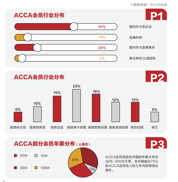 ACCA旨在帮助会员、学员在财会行业及商界建立成功的职业生涯。在目前国内超过4,000 万+的会计从业人员中,拥有 ACCA 专业资质人员仅有2.6 万,成为国内TOP0.1‰的极度稀缺性高端财会人才。人才稀缺、政府优待、企业认可,使得 ACCA 学员逐渐成为当下招聘市场上炙手可热的人才。据统计,ACCA 准会员毕业生起薪可高于普通毕业生 2-4 倍,他们多数在银行、证券、投资机构、会计师事务所、跨国公司、大型国企等担任各类高级职位。