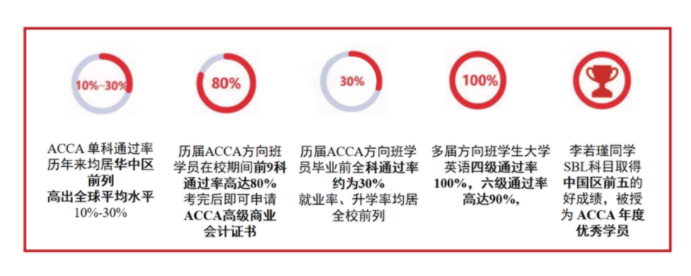 会计学ACCA方向班将英国特许公认会计师(ACCA)资格考试的13门课程纳入会计本科课程体系,使得ACCA方向班学生在财经知识方面“学贯中西”,其课程采取校内考核方式且学生取得相应的毕业学分,同时组织ACCA方向班学生参加非免试的7门ACCA专业课程全球统考。