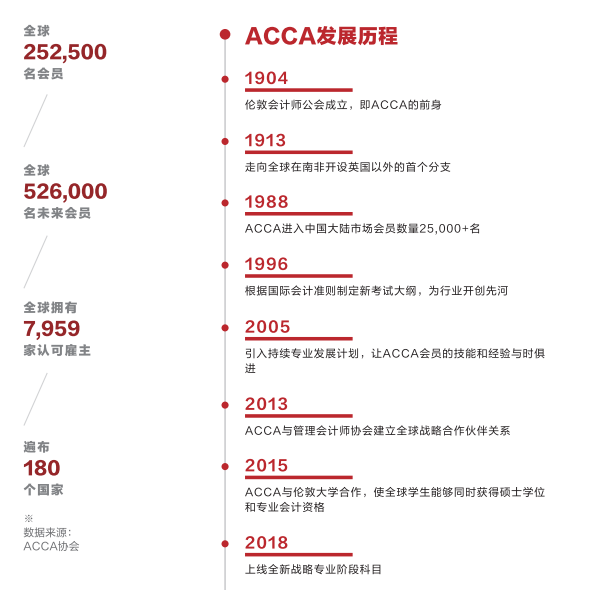 ACCA全称特许公认会计师公会,成立于1904年,总部设在英国,现已有百年历史。ACCA是全球具有前瞻思维且广受认可的国际专业会计师组织,为全世界有志投身于财会、金融以及管理领域的专业人才提供资格认证。