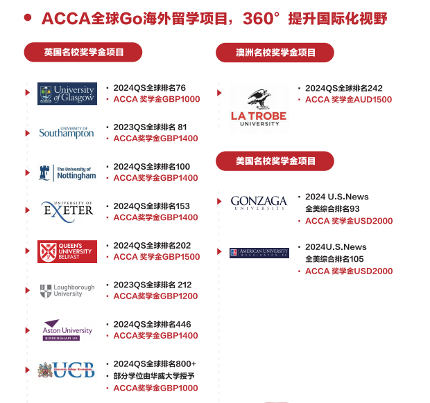 2)ACCA与众多优质海外高校也建立了合作伙伴关系,为ACCA学员提供了多种获得海外高校学历的渠道。ACCA学员可便捷地向包括这些海外优质高校的递交深造申请,学校针对ACCA推出了部分课程免修政策。学员在获得更高学历教育的同时,即可完成ACCA的学习并取得资格证书。如ACCA准会员可申请TOP名校伦敦大学硕士学位,最快半年即可获得教育部认可的世界名校学位。