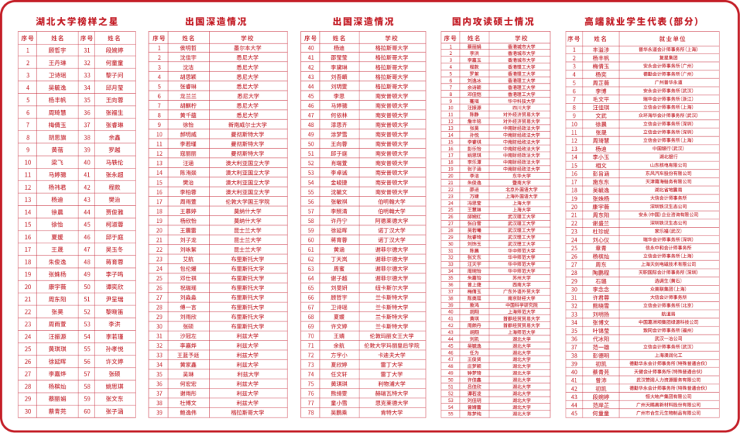 (五)历届毕业生就业率高,就业质量好。毕业生多数入职四大会计师事务所、大型国企、500强等优质名企,出国留学的同学,大部分进入世界TOP100名校留学深造,国内升学的同学,部分考取国内985/211/双一流高校研究生。