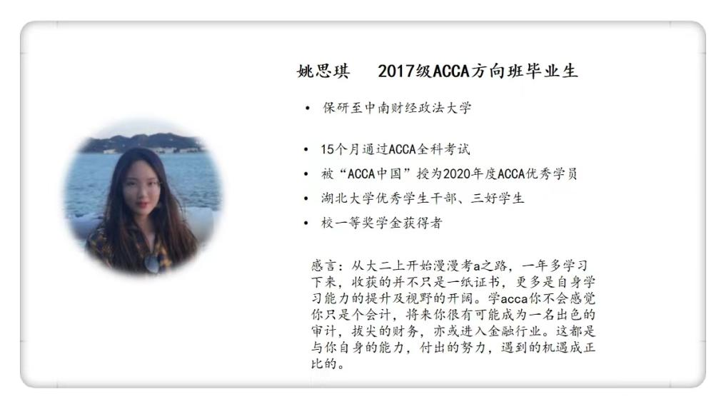 3.享受ACCA官方给予的6门课程免试优待。伟德国际victor1946会计学系ACCA方向班学生可享受ACCA官方授予的ACCA方向班专属6门官方免考政策,即我院会计学ACCA方向班学生入学即可获得BT/MA/FA/LW/TX/AA 6门科目全球统考免考,仅需完成PM/FR/FM 3门科目全球统考,最快大二下学期可获得ACCA高级商业会计证书,大三下学期即可通过ACCA全科考试,更快跻身ACCA准会员行列。