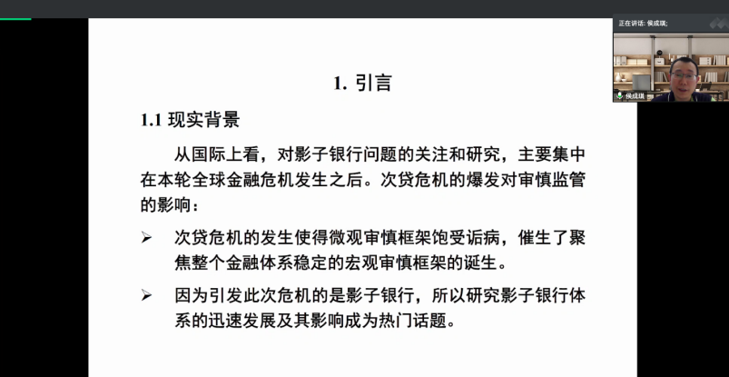 在引言中,侯教授指出了论文研究的现实背景是美国的次贷危机催生了整个金融体系稳定的宏观审慎框架的诞生以及影子银行是引发次贷危机的主要原因。论文的研究思路是在更广义的监管框架下研究影子银行的监管,为在合理发挥影子银行信用中介功能的同时,又能有效控制影子银行带来的系统性金融风险提供相应的政策。