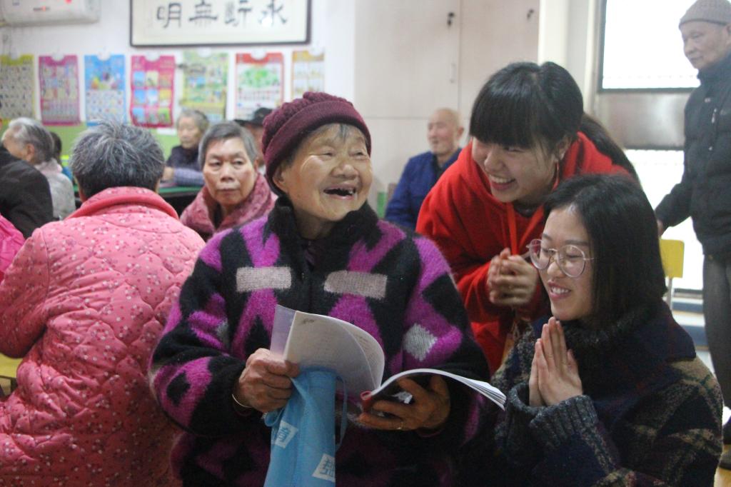 两个小时的志愿服务时间很快过去,志愿者们和老人一一告别。老人们为了表达谢意,决定全体合唱《红梅赞》和《中华民谣》送给今日前来的志愿者们。