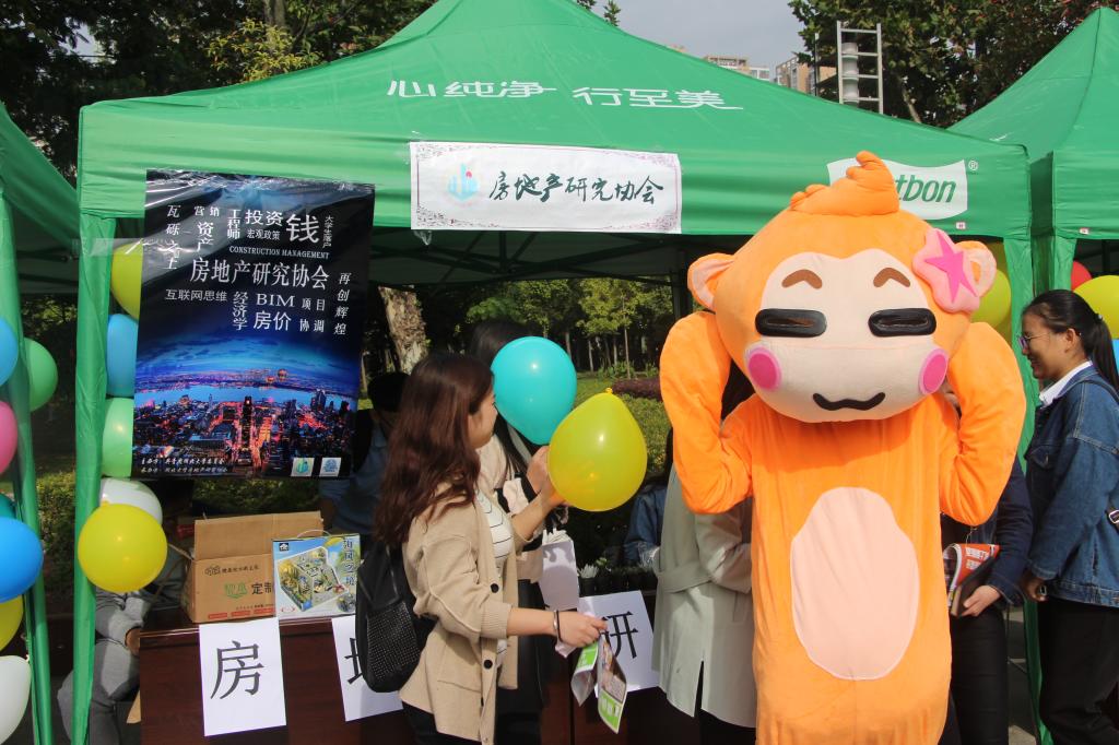 “关注房地产研究协会官Q即可抽奖,精品房模、青花餐具等奖品等你来拿,房协欢迎你的加入”,身着“悠嘻猴”玩偶服的宣传人员一边递上宣传单一边介绍道。在参与抽奖环节的学生中,来自国际教育学院汉语进修生陈威良、Yee与房地产研究协会会长2016级工程管理系易子卫进行了简短的中英文交流,询问并了解了房协宣传视频中建筑的绘制软件Auto CAD的相关操作。
