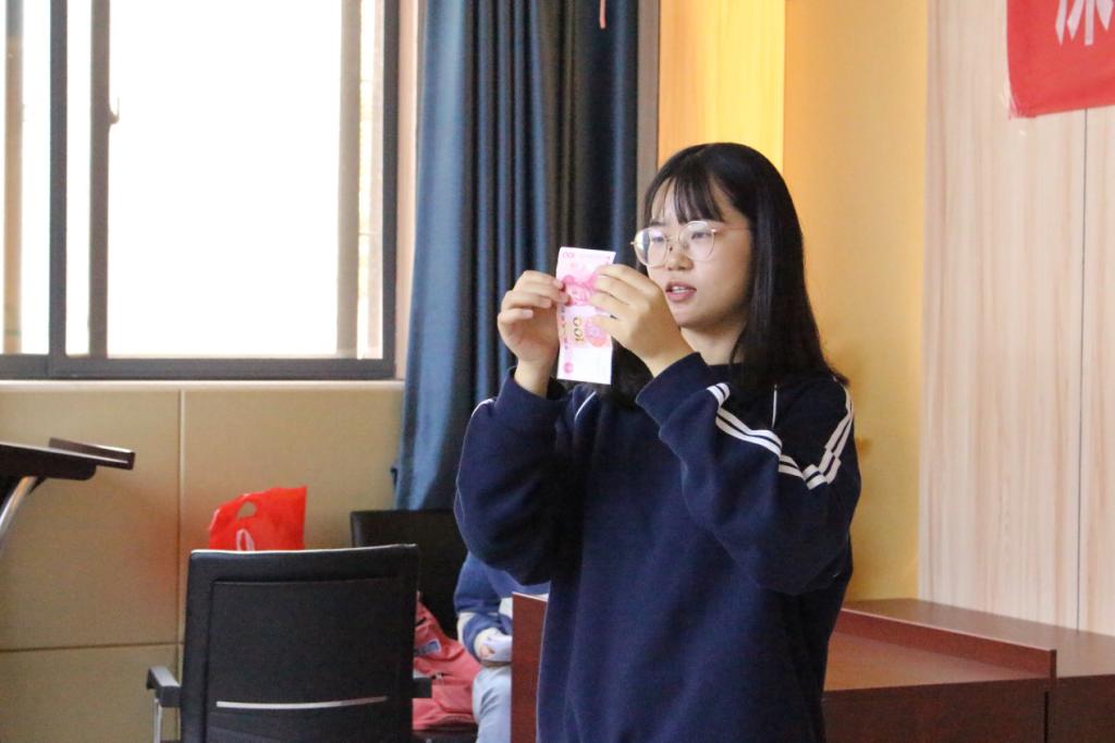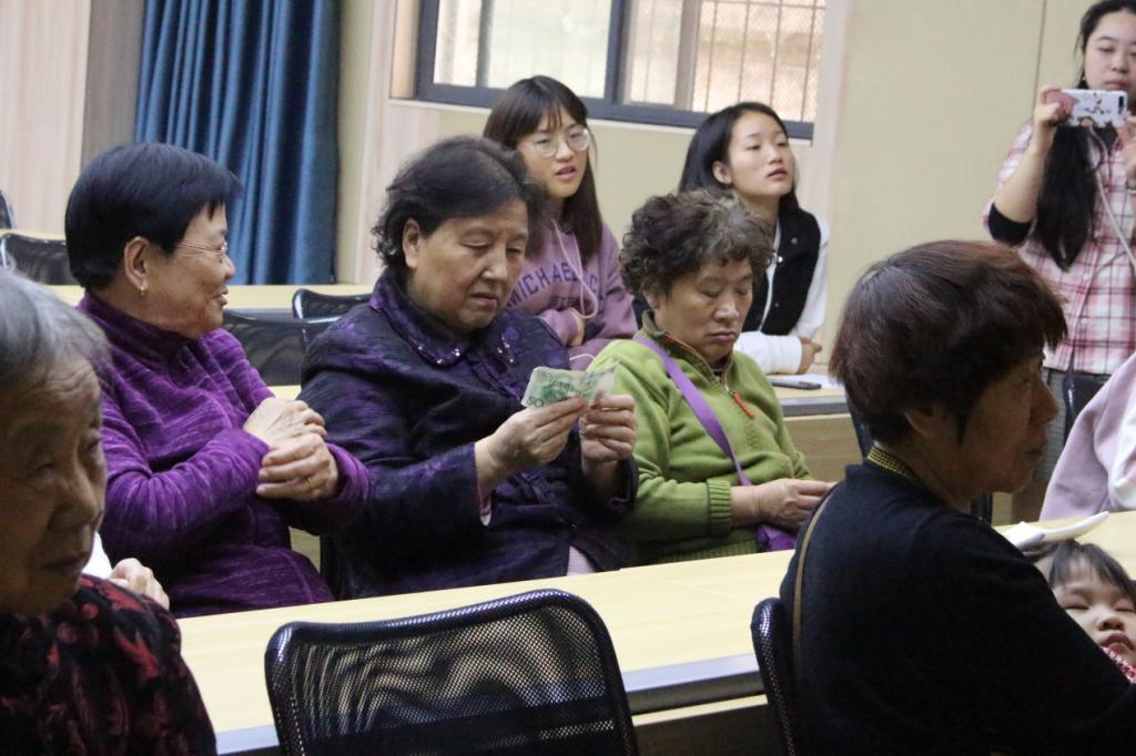 活动伊始,18级会计学专业的肖凯悦为社区老人做金融知识宣讲。宣讲重点介绍了老人高频遇到的电信诈骗问题和日渐普及的移动支付中的潜在风险。考虑到老年人大多使用现金,肖凯悦为老人们介绍了鉴别新旧版百元人民币真伪的多种方式。座下老人纷纷拿出自己口袋里的钞票进行鉴别。