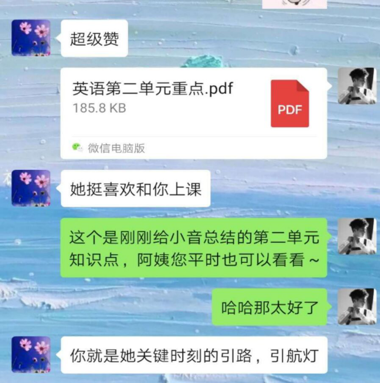 “老师,小学六年级的英语语法怎么安排教学比较好?我给小朋友上了两次语法课,但感觉融会贯通得不好,打算换一下教学形式”晚上10点多钟,2018级的黄巧悦同学在课程讨论群里求教。“小学六年级在语法上可以不用太着急,先大量阅读和背书,把语感培养好了再学原理,事半功倍。我马上发一份适合她现阶段学习的新概念二册的资料给你,你可以结合这上面的材料教学。”指导团队教师、伟德国际victor19462014届校友,目前就职于新东方教育科技集团的赵兴迅速回复,并把资料发到了群里。