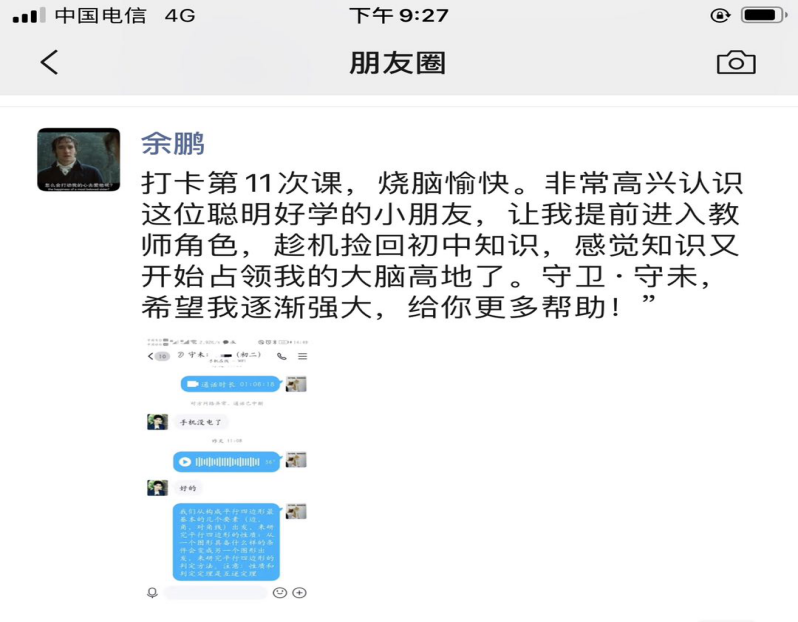 “打卡第11次课,烧脑愉快。非常高兴认识这位聪明好学的小朋友,让我提前进入教师角色,重温初中知识,感觉知识又开始占领我的大脑高地了。守卫·守未,希望我逐渐强大,给你更多帮助!”这次服务队的毕业生党员余鹏在他朋友圈发出的感慨。