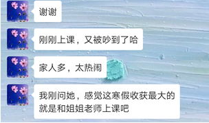 当老师的快乐有三:一是教学小有成果,二是得到家长的支持,三是和学生成为好朋友。我想,我收获了三份的快乐。特别是得到家长和学生的肯定时,那种开心是难以描述的。基本每次和小音妈妈分享完小音的上课情况后,小音妈妈都会给予我鼓励,她说道“你就是她关键时刻的引航灯”,这些话语,我的心里都会受到很大鼓舞。小音说“老师,你真厉害”,“你是我寒假最大的收获”,这些话语都让我无比开心。