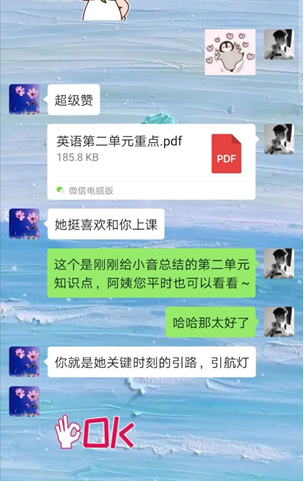 我对接的是一名初二的学生,她叫小音。小音的妈妈是汉正街派出所的一名警官。在拿到对接信息后我首先和小音妈妈取得了联系,了解了小音的基本情况,还得知小音的妈妈十分好学,平时也在自学英语。聊天过程中李妈妈非常热情,她说“小音遇到你是缘分,也是她的幸运,恭喜你多了一个妹妹啦”。初为人师的紧张在和李妈妈温暖的谈话后,一下子烟消云散了。但是辅导需要对症下药,正如李妈妈说的“现在网络信息很发达,资料很齐全,但是关键是要找到适合学生的”。于是我和小音进行了第一次聊天,聊天中我得知小音的英语底子不错,但是阅读和完型填空是她最头疼的事情。阅读和完型填空一是需要词汇量,能迅速理解文章大意;二是需要一定的句子成分分析能力,能一下抓住句子核心;三是需要大量的做题训练和解题技巧。因此我便和小音约定,每天需要做一篇完型填空或者阅读理解,每周末检查。好久没接触过初中的题型了,我专门花了时间研究初二的试卷,并把解题技巧发给了小音。