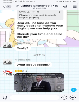 教学相长,小音的学习积极性和新奇的学习方式也在持续感染着我。前几天小音把我拉进了一个纯英语聊天群,里面有她的同学,还有一些外国人,但是大多数基本是陌生人。里面的外国人口音十分纯正,大家都是用英语交流,英语氛围很浓厚,很多句子都超出了八年级的难度,小音有时在群里看到不会的句子也会发过来问我。小音说自己每天都会抽空在群里学习英语,因为她很喜欢英语。这种对学习的兴趣和对知识的主动渴求深深感染了我,也让我开始反思自己最近在家的学习状态。