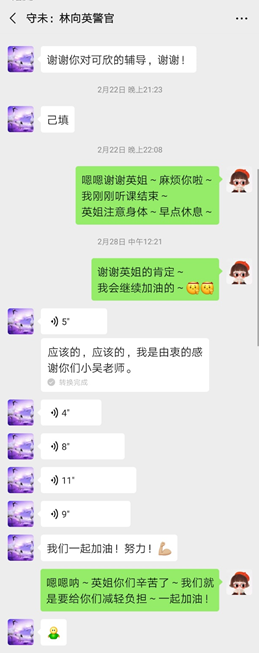 在与小可欣交流了一段时间之后,我将自己与她的聊天截图与教学总结发给了林警官,她回复我说辛苦了,感谢我的付出,我很开心能够得到了林警官的认可!