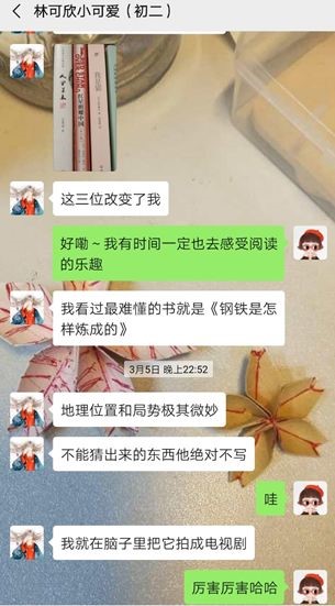 从冷冰冰的一问一答式对话,到和我分享她和她“死对头”同桌的故事;从不愿意主动问我题目,到和我分享自己给爸妈煮的饺子、自己的读书笔记,我和小可欣慢慢地变成了几乎无话不说的好朋友。很感谢这次机会,让我结识到这位可爱又懂事的姑娘。