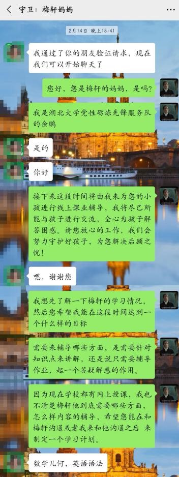 2月14日,正好是周五,收到对接信息的我,刚开始了解这次党性砺炼先锋服务活动的兴奋不知所去,取而代之的,是我内心的忐忑。对自己学识的不够自信使我开始怀疑自己是否有资格去教初二的学生。好在我的组员们以及服务队的队员们都在群里互相鼓励,用半个小时平复心情后,去添加了自己所对接的梅轩小朋友的妈妈,向她了解梅轩的具体情况。没想到,和他妈妈的第一次对话,就让我不知所措,因为我了解到的信息是梅轩小朋友在数学和语文方面需要加强,而真正对接时候他的妈妈说是数学和英语。