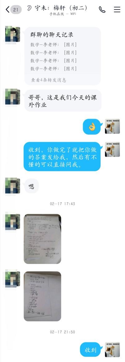 没几节课的功夫,我们就熟悉了起来,梅轩在一周没见到我之后,周六早早就开始询问今天什么时候上课。我感觉到特别开心,是你的努力被别人认可的开心。我们这些参加活动的大学生根据辅导的科目、年级都有专门的交流群,我加了很多,在里面很少说话,但是看到他们分享的资料,我会下意识保存并转发给梅轩,这些都是我在这些天的改变。