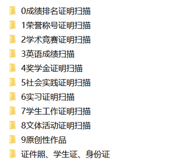 其余必备材料:成绩排名扫描件、各大荣誉证书扫描件、学术竞赛扫描件等等。为了方便整理,可以归类成文件夹。
